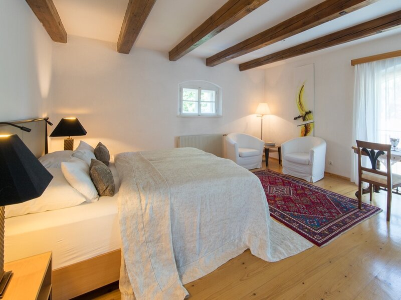 Das Zimmer ist ca. 45m2 groß und ist im ehemaligen Schüttkasten (Getreidespeicher) neu ausgebaut worden. Original sind noch die Holzbalken der Decke. Das Doppelbett hat getrennte Matratzen und ein offenes Fußende, weiters gibt es Internetzugang, Minibar und Flachbildschirm TV.